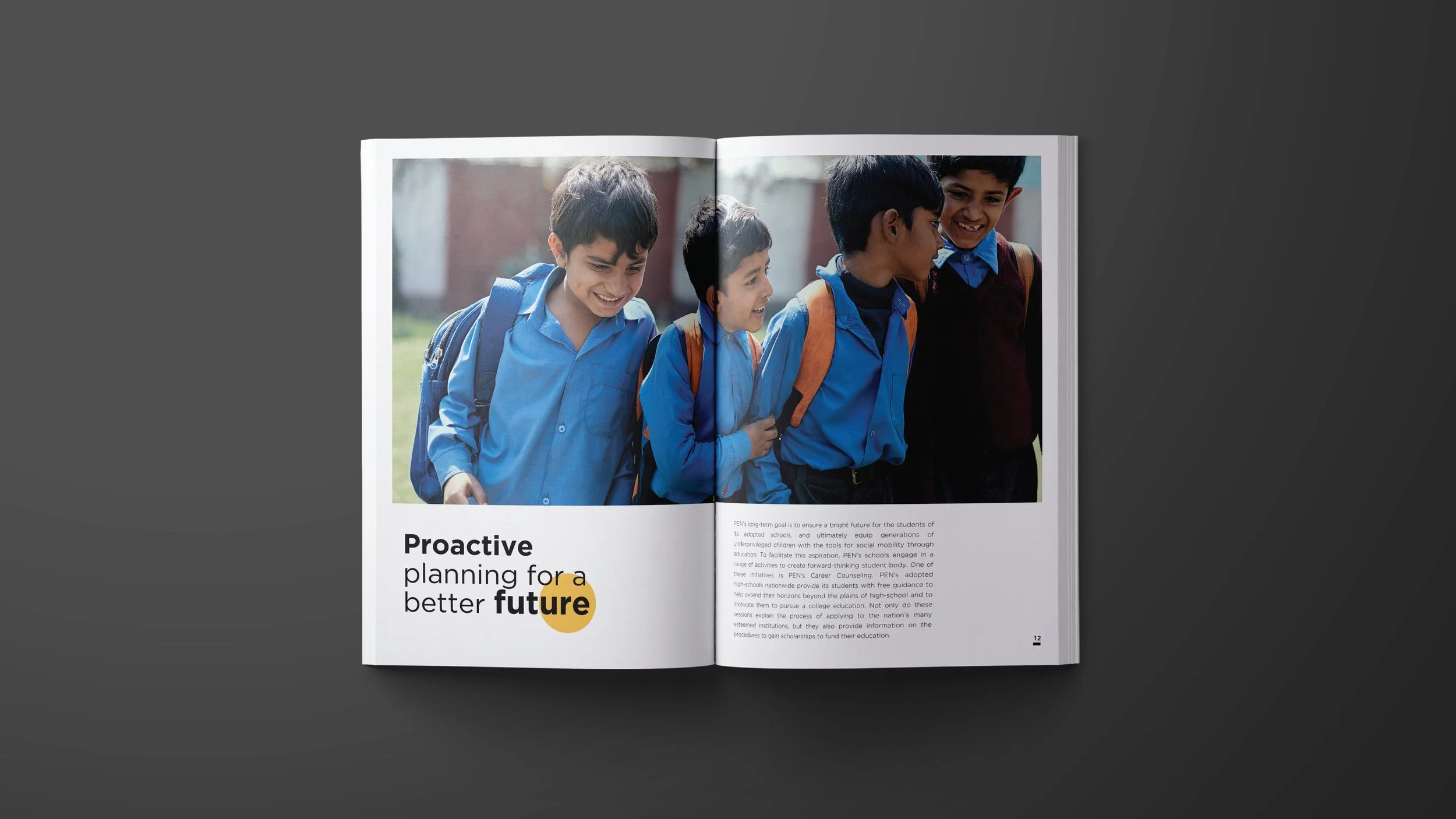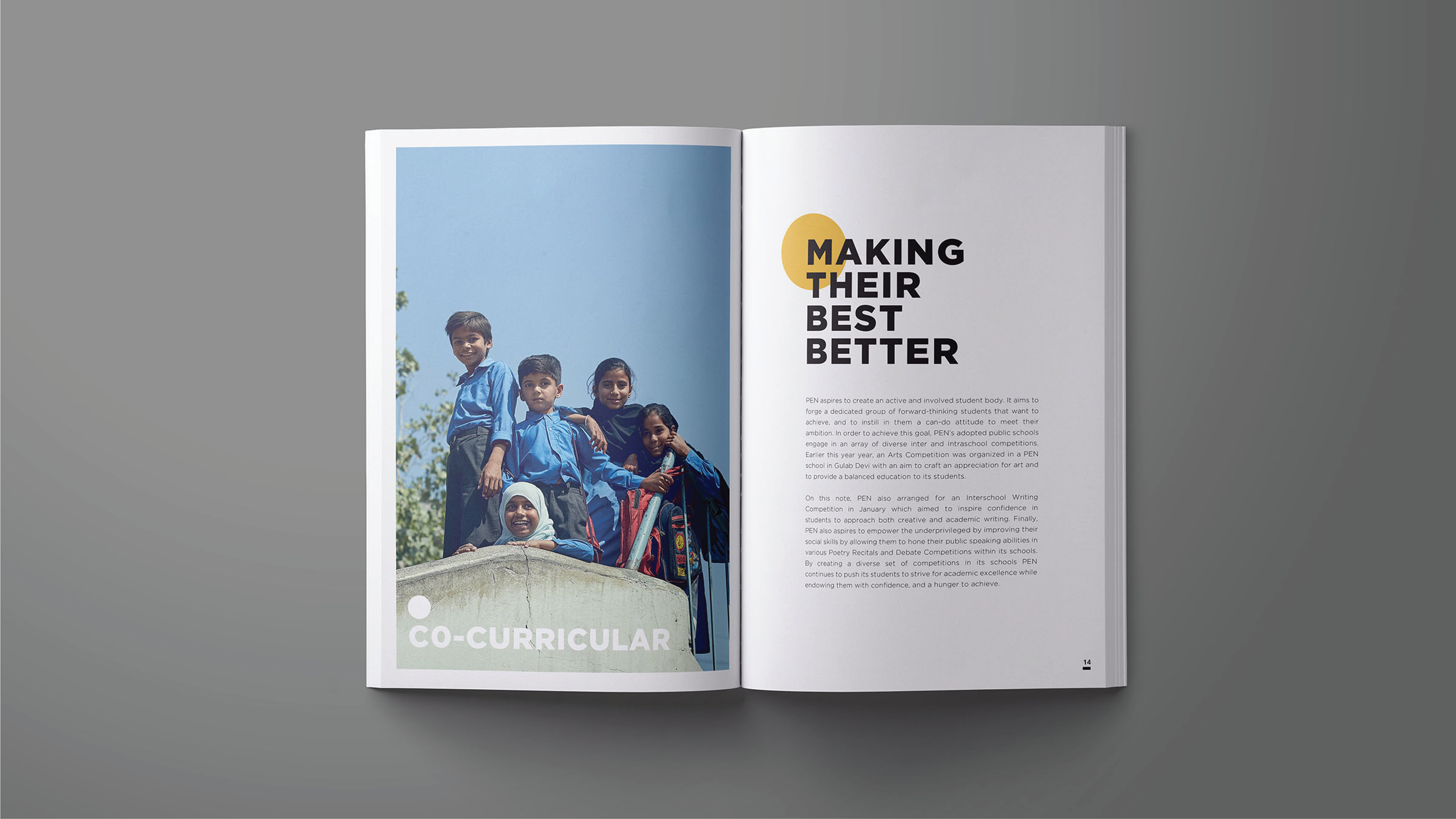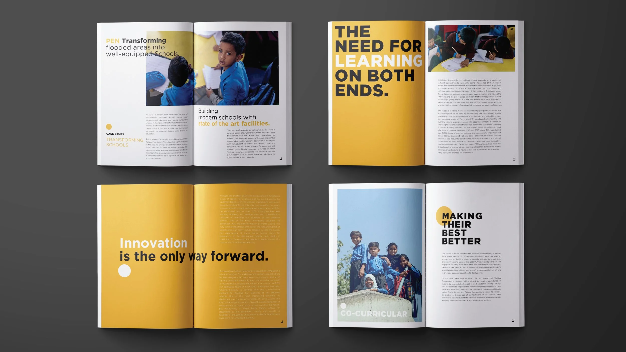Progressive Education Network (PEN) is an NGO that is committed towards building schools and educating the underprivileged children in Pakistan. For the Editorial Design, I photographed children in their element within the school premises, and captured their candid expressions while studying, interacting and sharing smiles in the playground in order to create dynamic and impactful imagery. The layout features ‘Yellow Circle’ with bold typography in black. Circle is used as a symbolic design element inspired by sun, the source of light, depicting the promising future that PEN aims to achieve by educating the underpriviliged children. Bold typographical compositions with variations in circle overlap create a versatile and modern design language. Yellow color complements the cheerful imagery and the cause of promoting education amongst the underpriviliged children. Typography is set in Gotham font family.