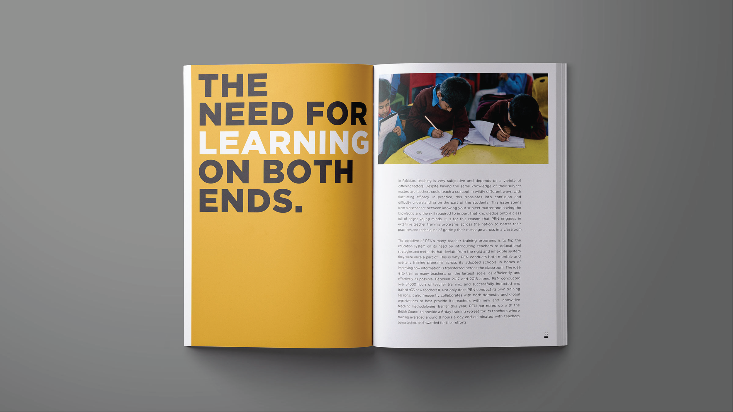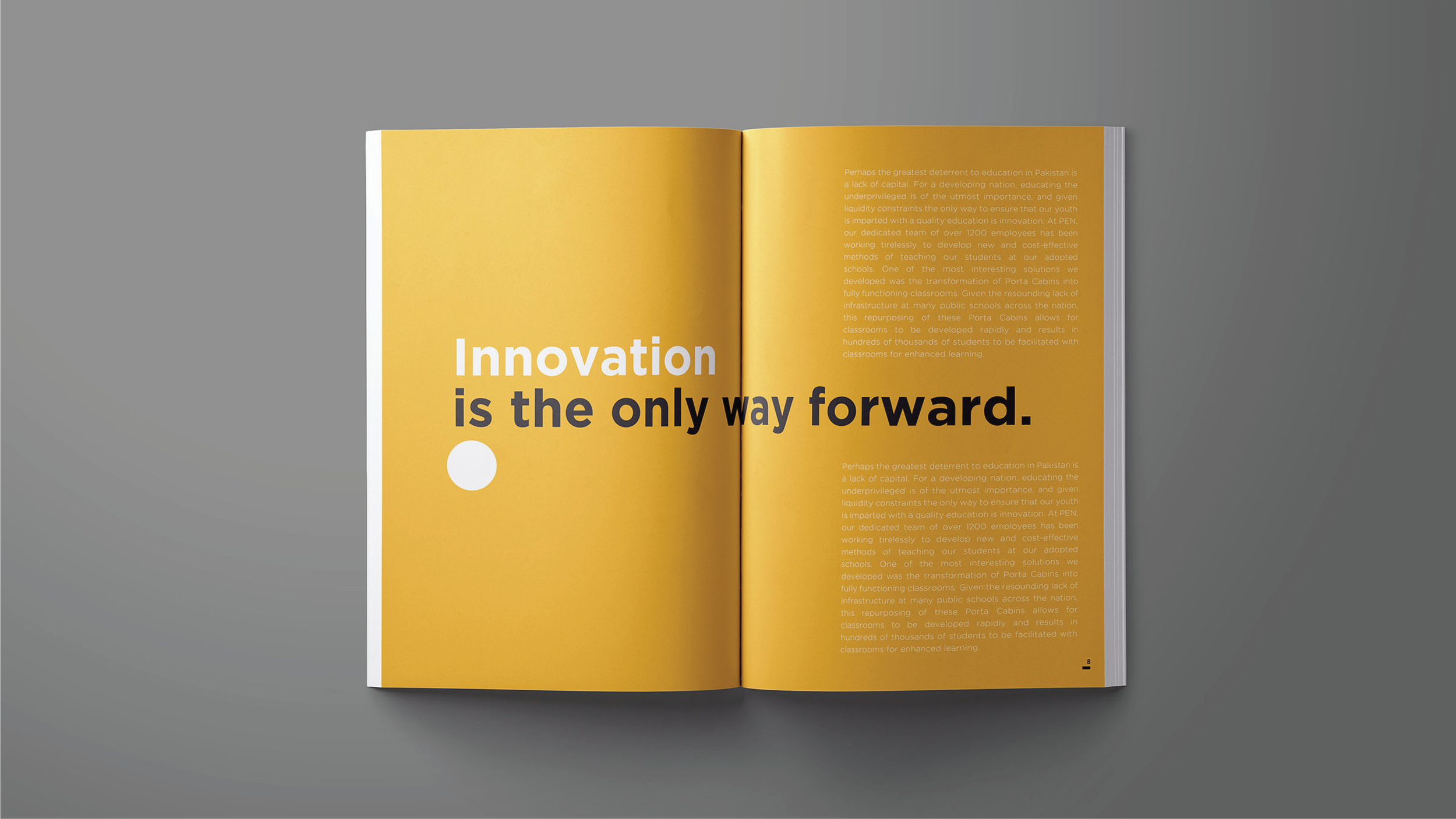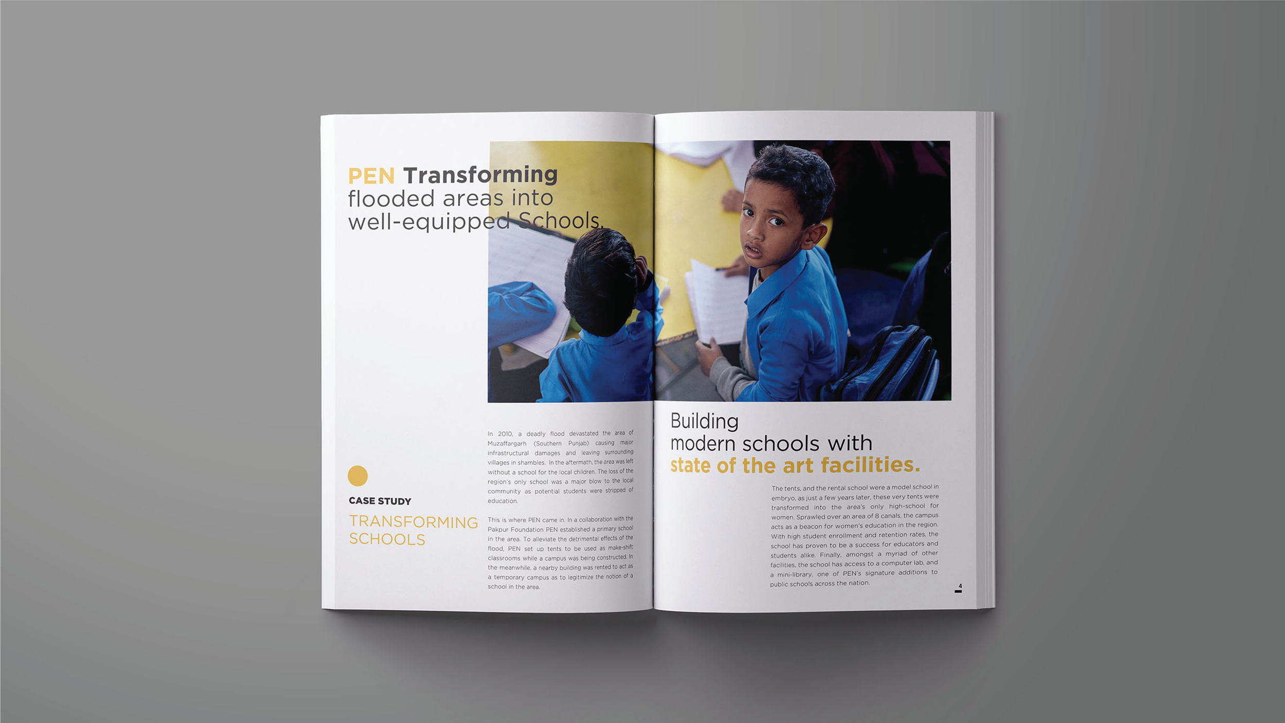 Progressive Education Network (PEN) is an NGO that is committed towards building schools and educating the underprivileged children in Pakistan. For the Editorial Design, I photographed children in their element within the school premises, and captured their candid expressions while studying, interacting and sharing smiles in the playground in order to create dynamic and impactful imagery. The layout features ‘Yellow Circle’ with bold typography in black. Circle is used as a symbolic design element inspired by sun, the source of light, depicting the promising future that PEN aims to achieve by educating the underpriviliged children. Bold typographical compositions with variations in circle overlap create a versatile and modern design language. Yellow color complements the cheerful imagery and the cause of promoting education amongst the underpriviliged children. Typography is set in Gotham font family.