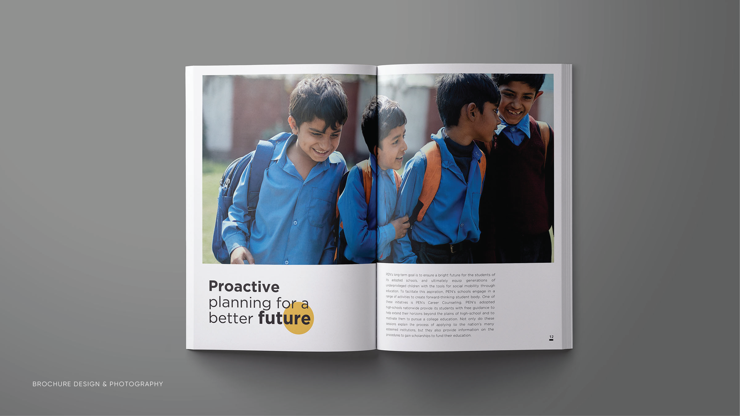 Progressive Education Network (PEN) is an NGO that is committed towards building schools and educating the underprivileged children in Pakistan. For the Editorial Design, I photographed children in their element within the school premises, and captured their candid expressions while studying, interacting and sharing smiles in the playground in order to create dynamic and impactful imagery for the design. The editorial features bold imagery, and follows a vibrant and contemporary design aesthetic. The layout features ‘Yellow Circle’ with bold typography in black. Circle is used as a symbolic design element inspired by sun, the source of light, depicting the promising future that PEN aims to achieve by educating the underprivileged students. Bold typographical compositions with variations in circle overlap create a versatile and modern design language. Yellow color complements the cheerful imagery and the cause of promoting education amongst the underprivileged children. Typography is set in Gotham font family.