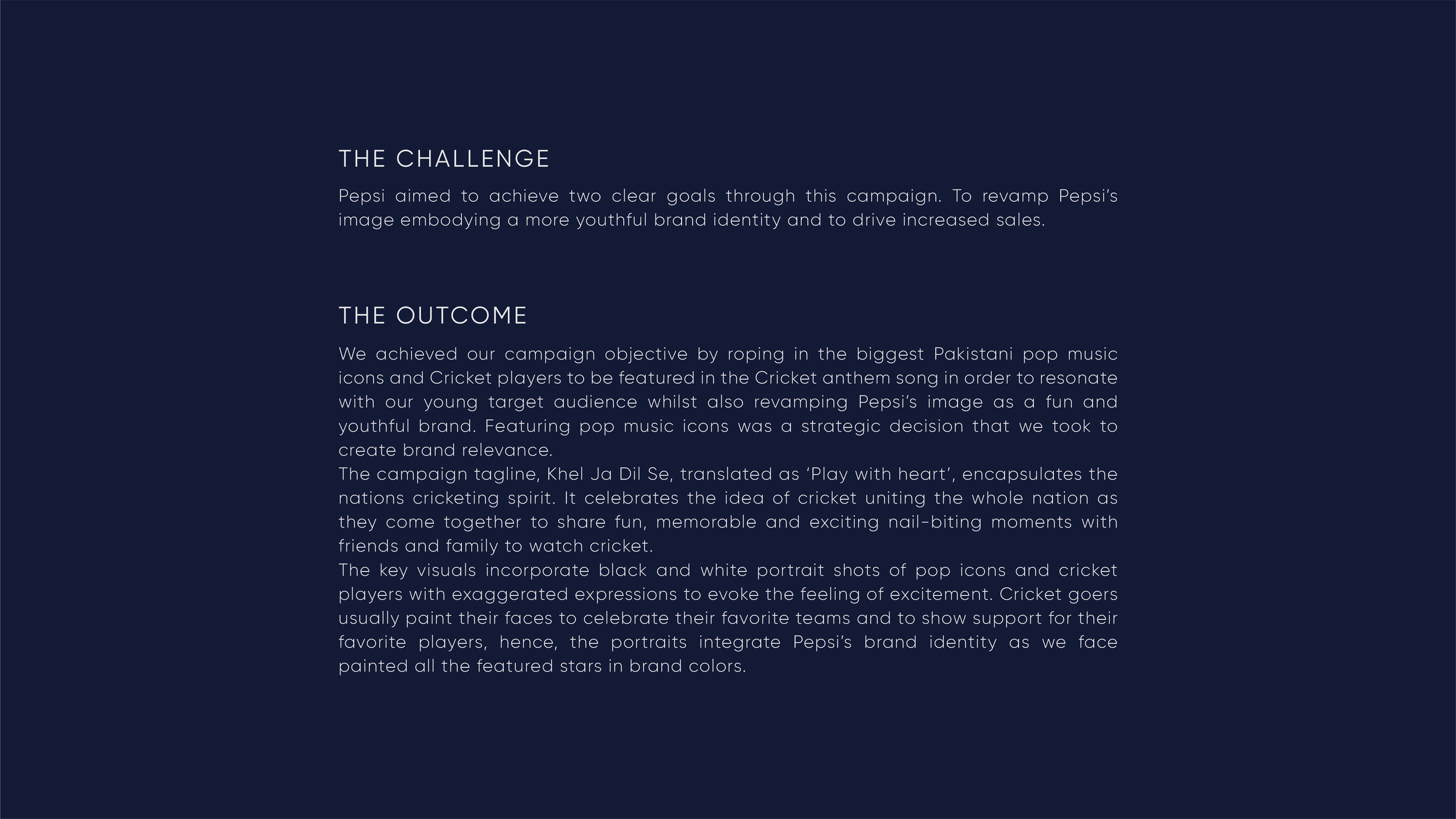 In anticipation of 2020 cricket season in Pakistan and the kick off the Pakistan Super League (PSL), Pepsi launched its Cricket Campaign to build upon the Cricket fever which is the most loved and watched sport in Pakistan. The brand has strong affinity for cricket for the longest time and it has consistently starred Cricket Icons or players as the face of the brand. We developed the 360° campaign for Pepsi centered around the Cricket anthem.