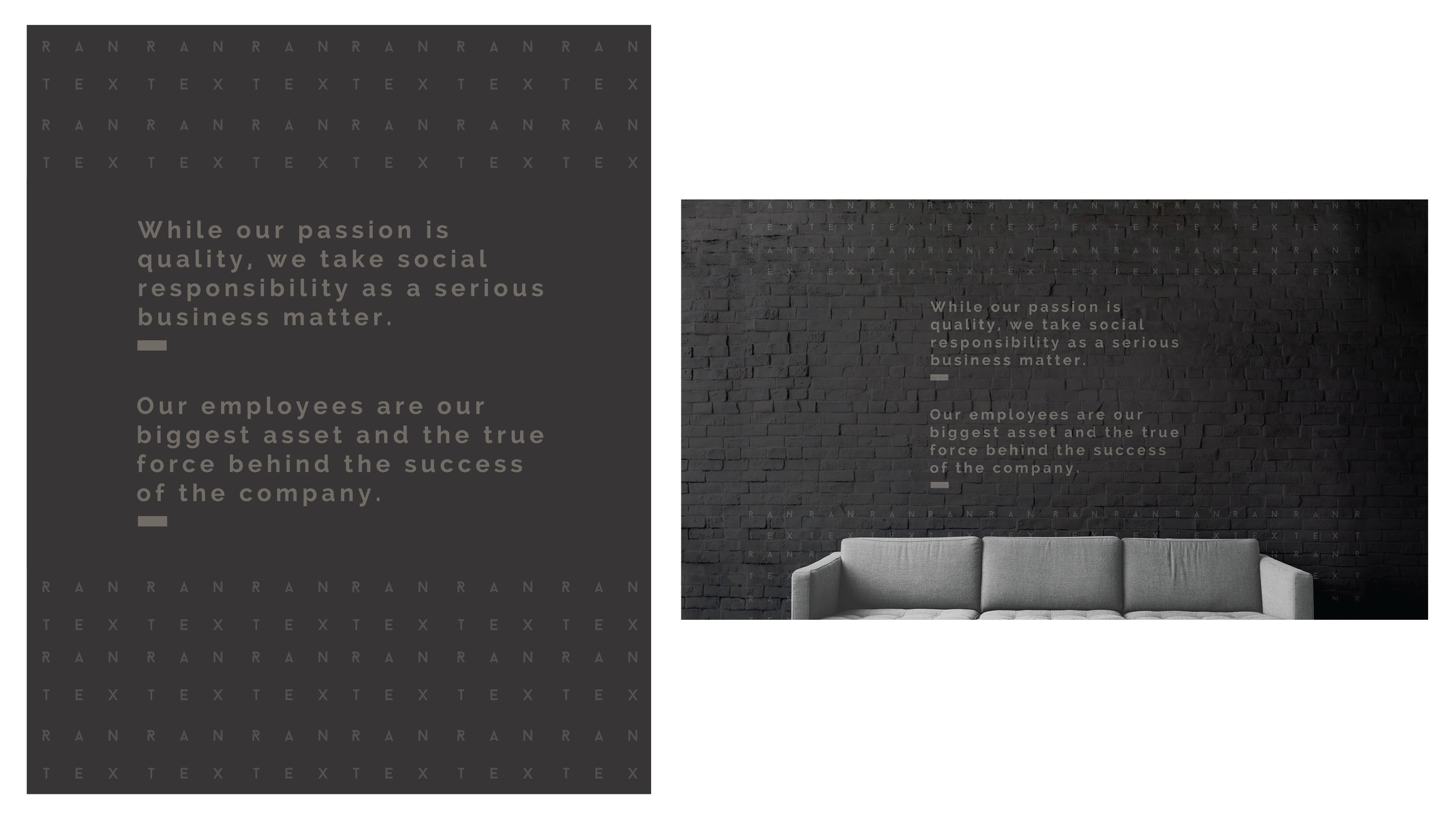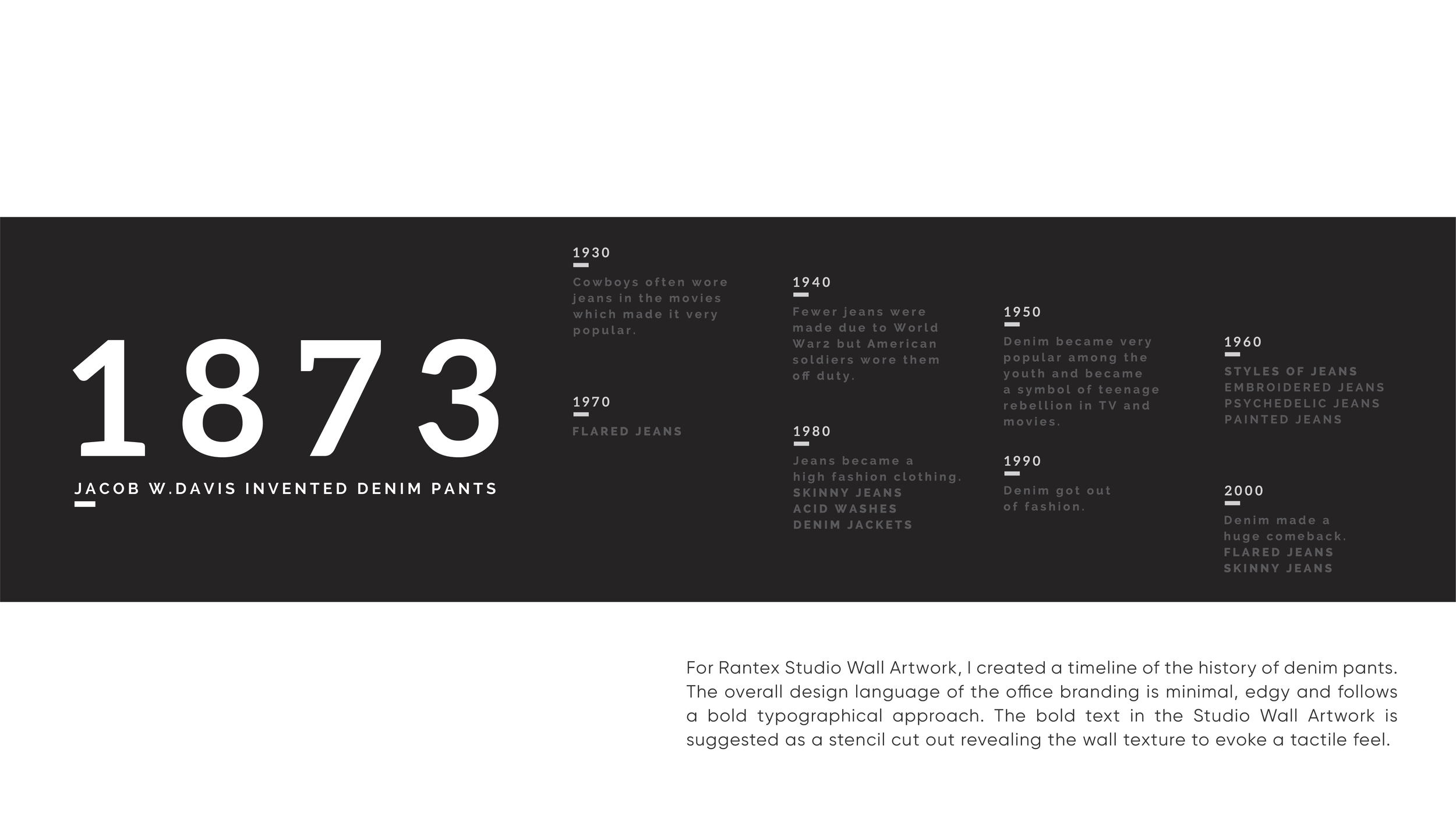 The dynamic typography is set in Baron and Raleway font as primary type palette while Avenir and Aleo is used as secondary font palette. Primary colors used across the branding is kept neutral with hues of black and white. For the meeting room wall artwork, I designed a map highlighting all the countries where Rantex exports denim. Map incorporates an intricate diagonal line pattern which draws inspiration from the actual denim thread work. Developed a Rantex Logo Pattern that acts as a decorative and functional device and can be used across all communication. The wall graphics also feature relevant quotes and brand’s vision in bold type across different floors.