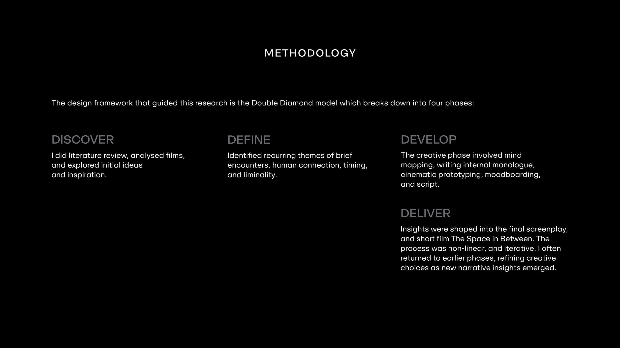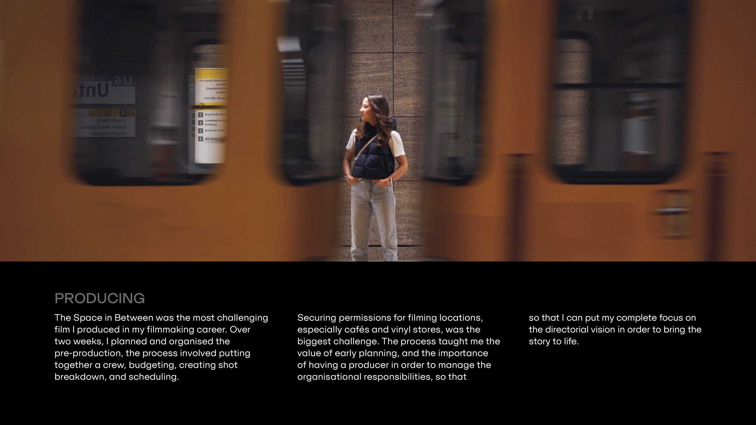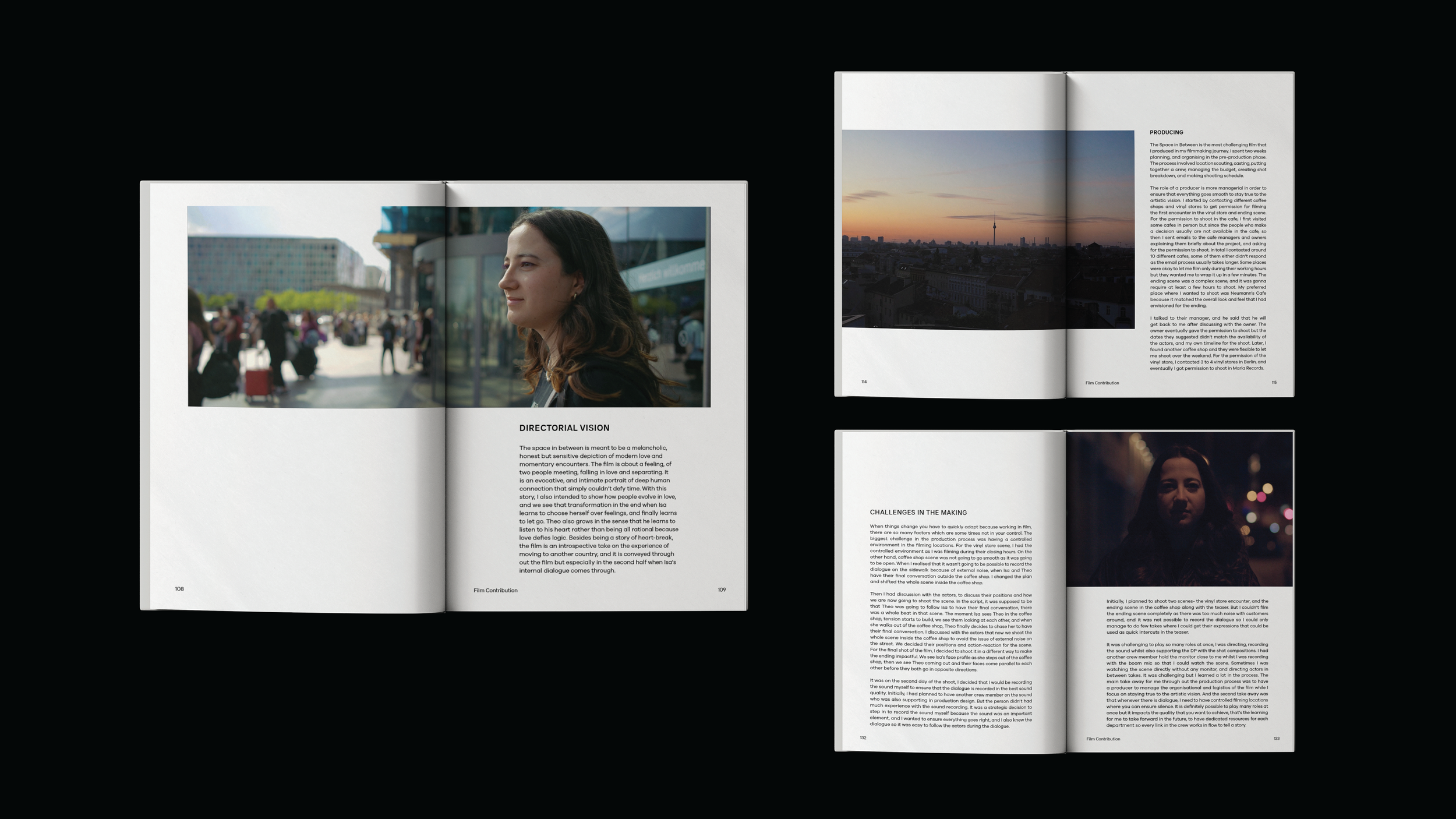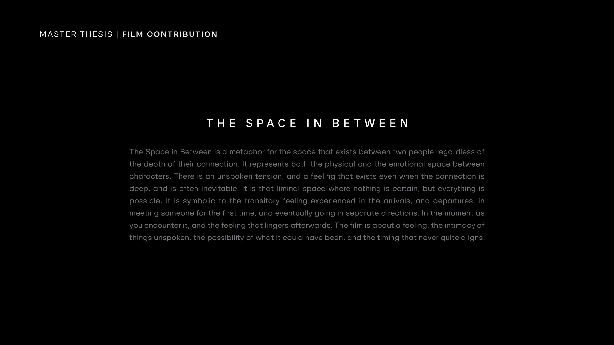 The practical contribution is a short film, The Space in Between, which follows two complex characters navigating momentary encounters, silence, and emotional distance. Set in Berlin, the film is centred on the protagonist in a transitory state, between places, and versions of herself, mirroring the emotional liminality at the core of the story.