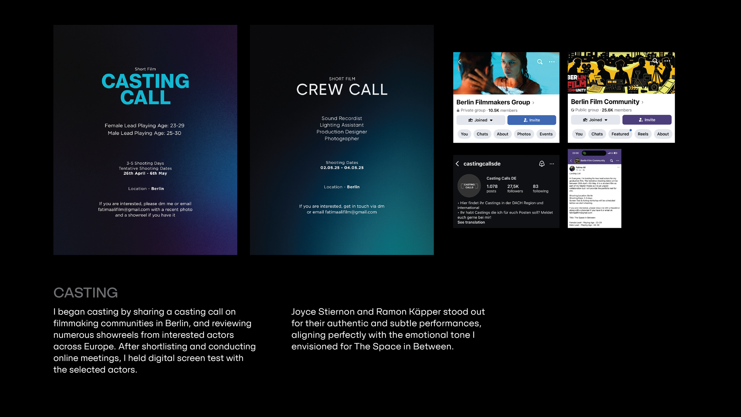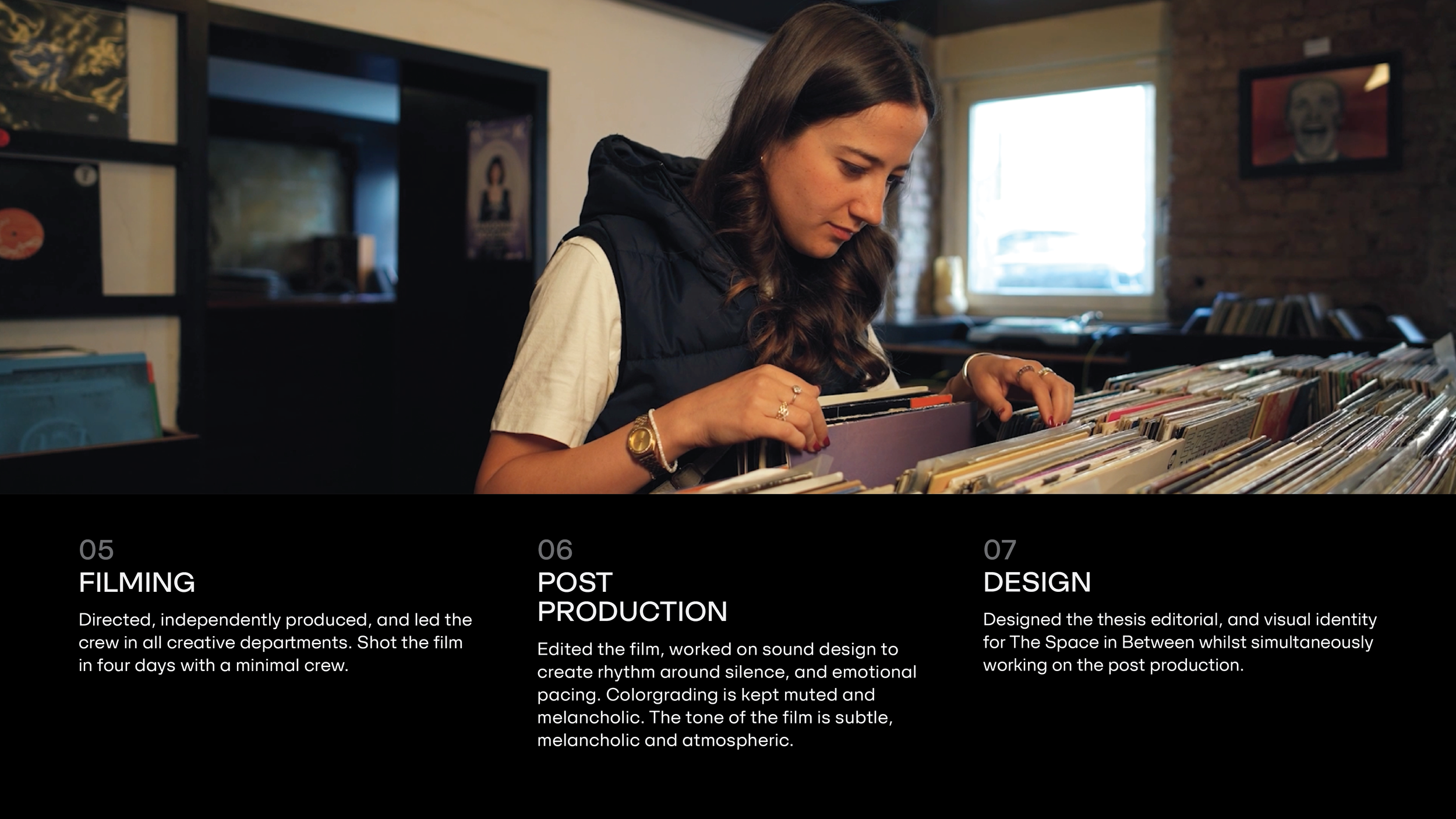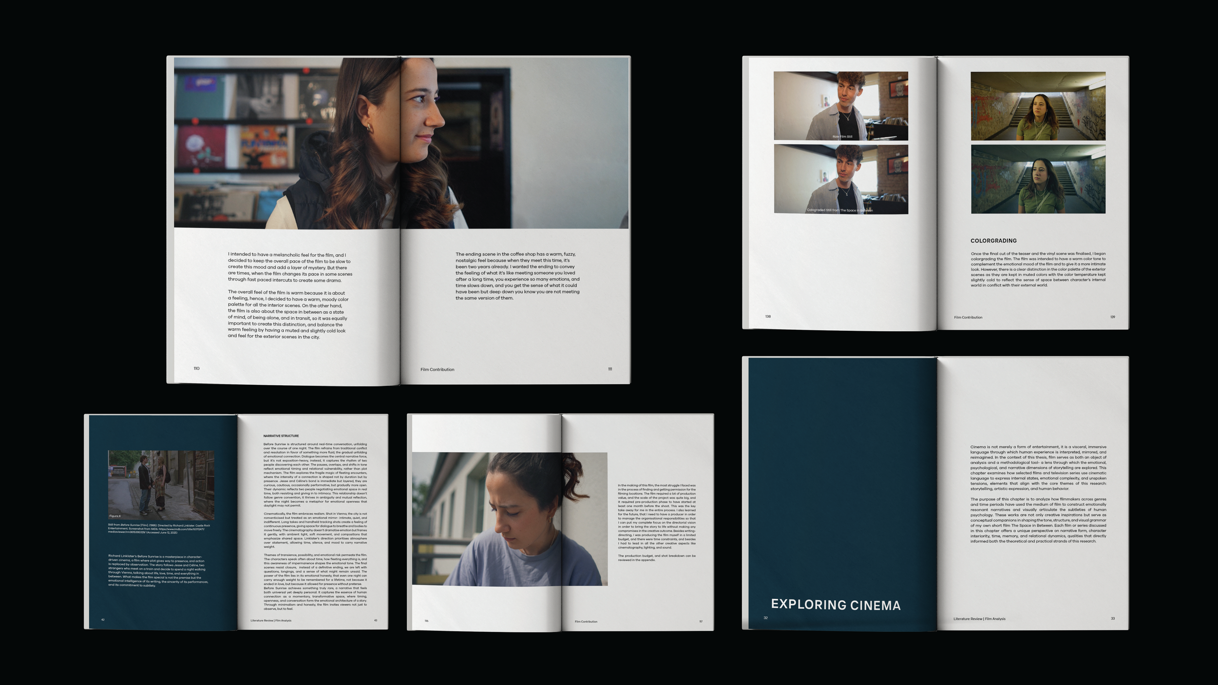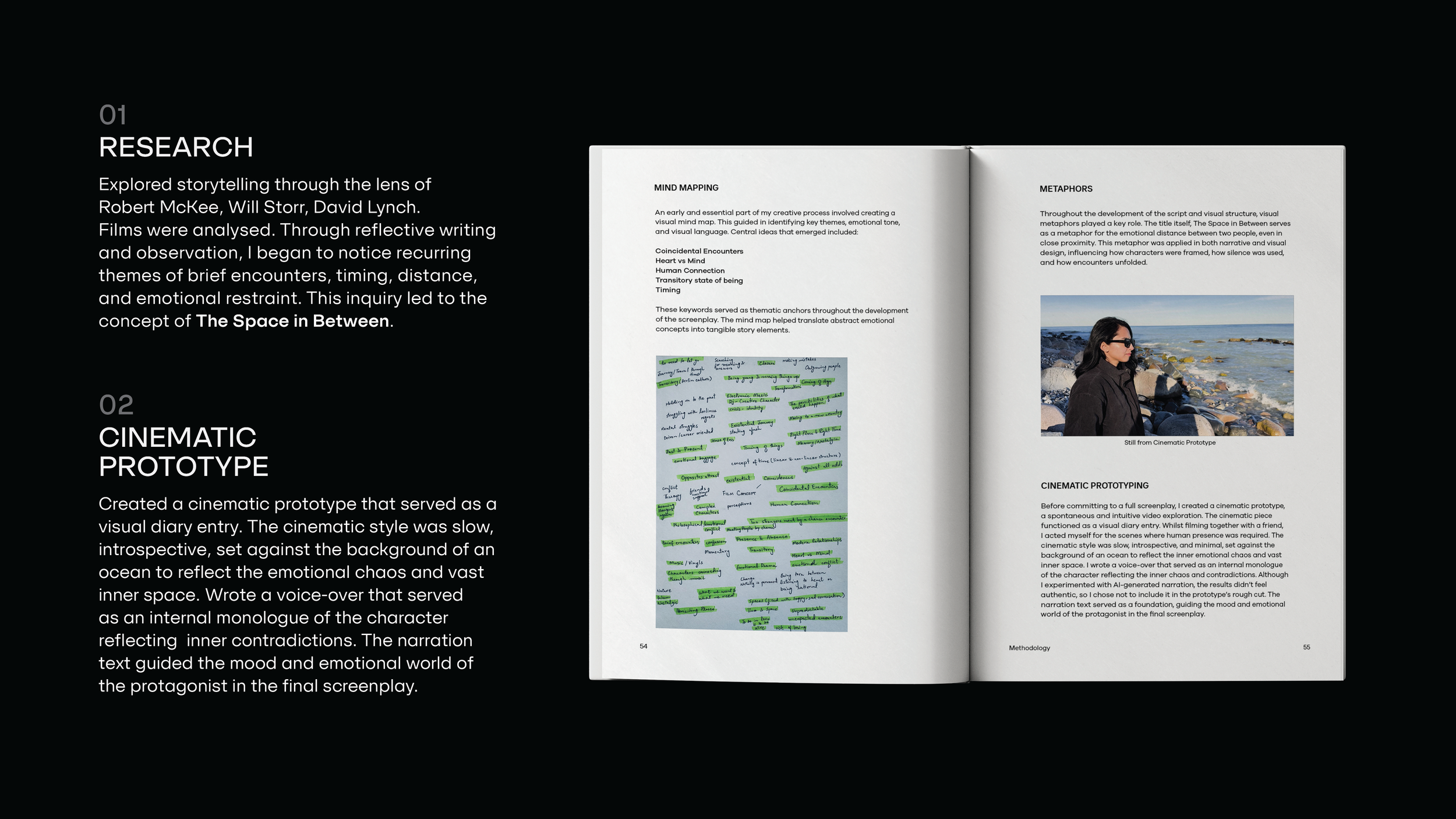 The practical contribution is a short film, The Space in Between, which follows two complex characters navigating momentary encounters, silence, and emotional distance. Set in Berlin, the film is centred on the protagonist in a transitory state, between places, and versions of herself, mirroring the emotional liminality at the core of the story.